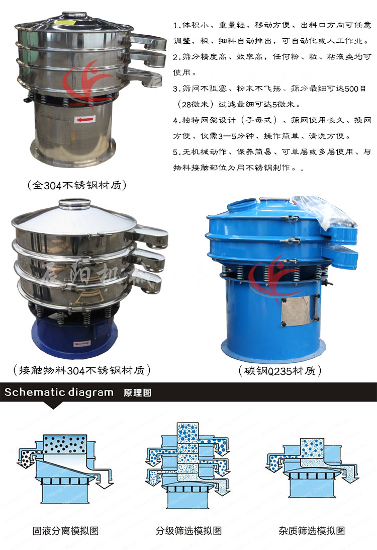 超聲波振動篩是將220v、50HZ或110v、60HZ電能轉(zhuǎn)化為38KHZ的高頻電能,輸入超聲換能器,將其變成38KHZ機械振動,從而達到**篩分和清網(wǎng)的目的。改系統(tǒng)在傳統(tǒng)的振動篩基礎上再篩網(wǎng)上引入一個低振幅、高頻率的超聲波振動波(機械波)在篩網(wǎng)上面疊加一個高頻率低振幅的超聲振動儀,超微細粉體接受巨大的超聲加速度,使篩面上的物料**保持懸浮狀態(tài),從而抑制粘附、摩擦、平降、等堵網(wǎng)因素。解決了強吸附性、易團聚、高靜電、高精細、高密度、輕比重等篩分難題,使超細微粉篩分不再難事,特別適合高品質(zhì)、精細粉體的用戶使用
